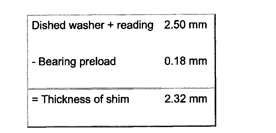 The specified preload is achieved if the bearing preload of 0.18 mm is subtracted from the figure obtained from the measurement (dished washer + reading) of 2.50 mm.