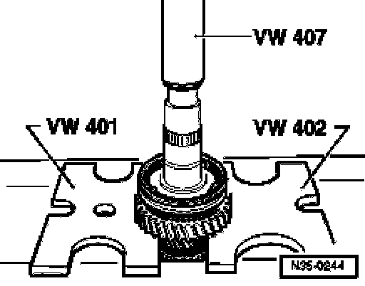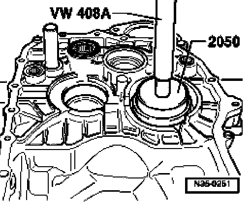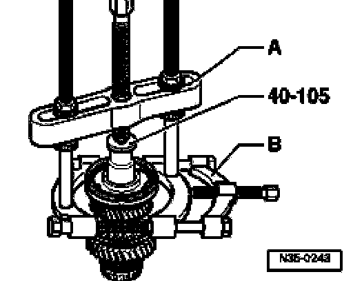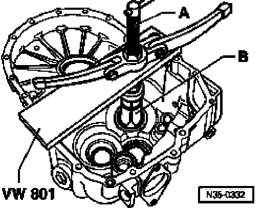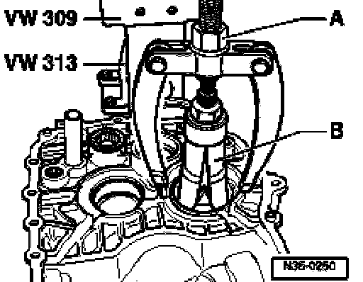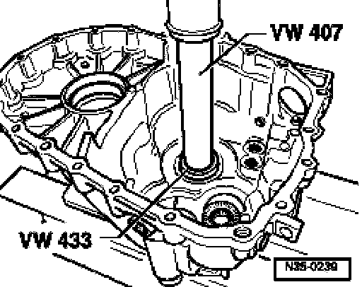 ^ Support transmission housing with press tool 40-20 directly below bearing mounting.