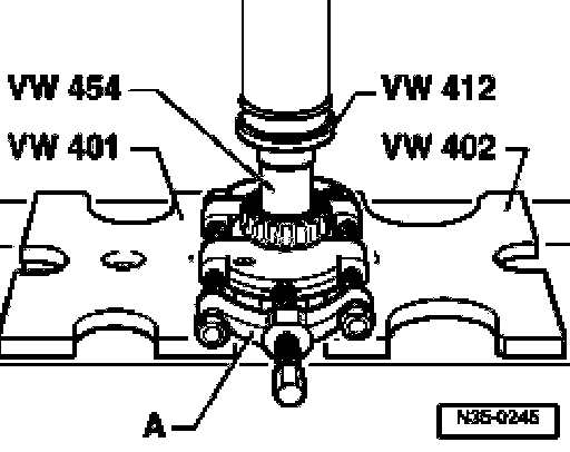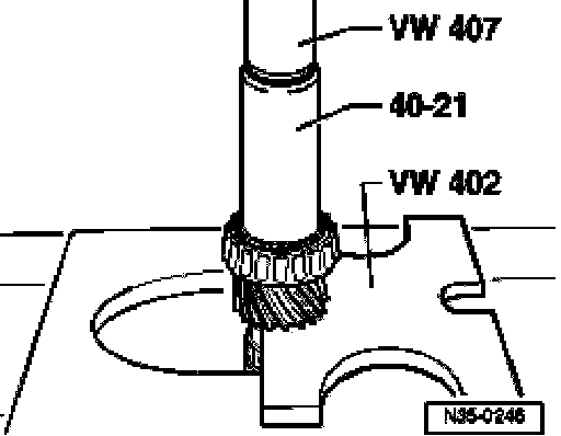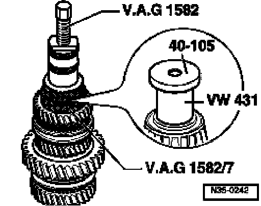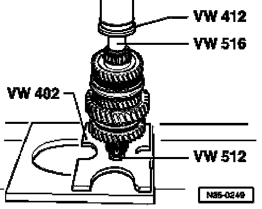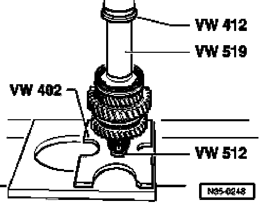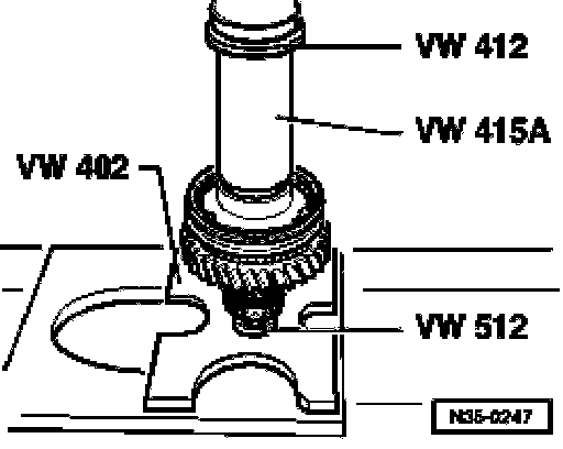 ^ Before mounting puller, position press piece VW 431 in output shaft and set thrust plate 40-105 on it.