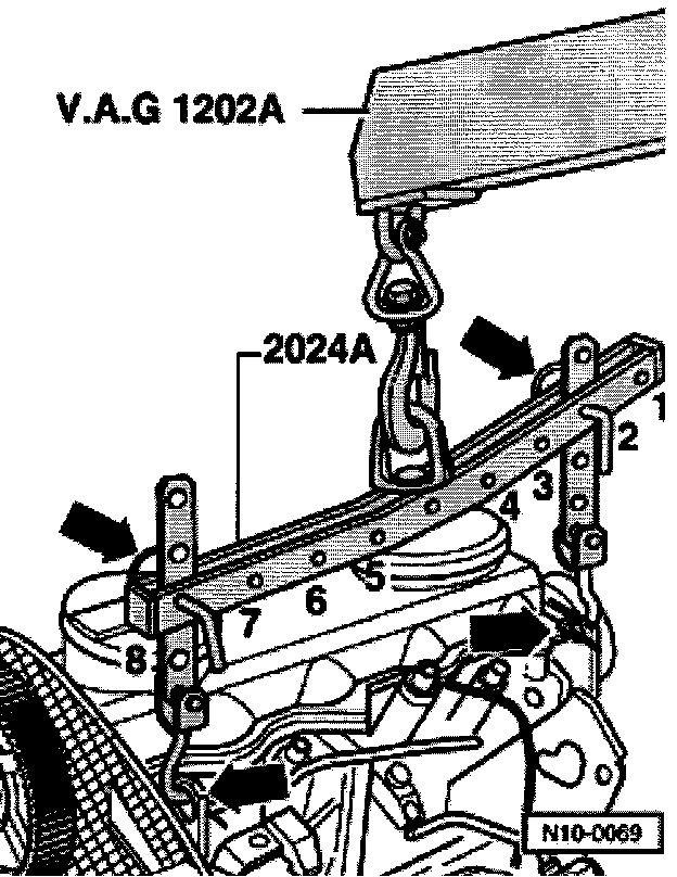 - Attach 2024A engine sling as follows and lift from VAG 1383 engine/transmission jack using workshop crane: