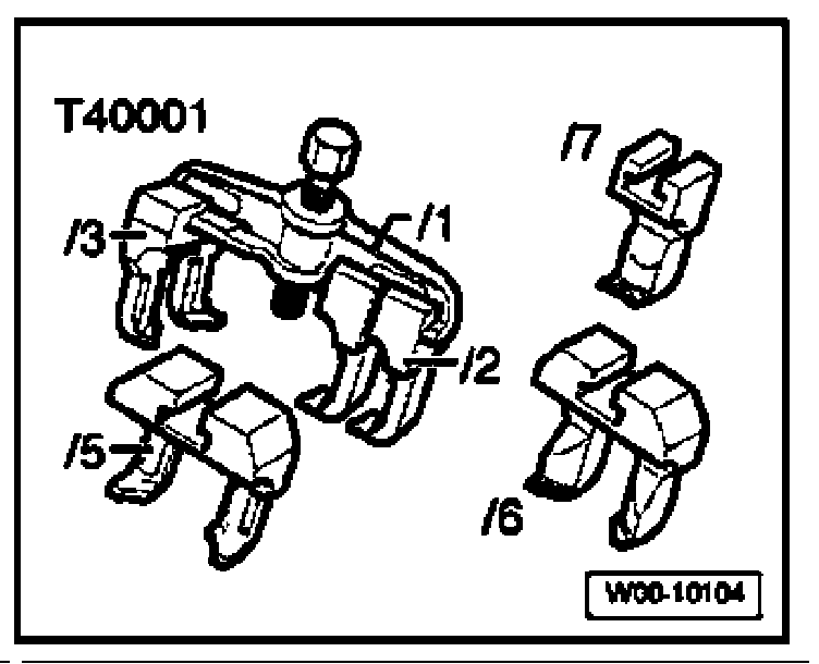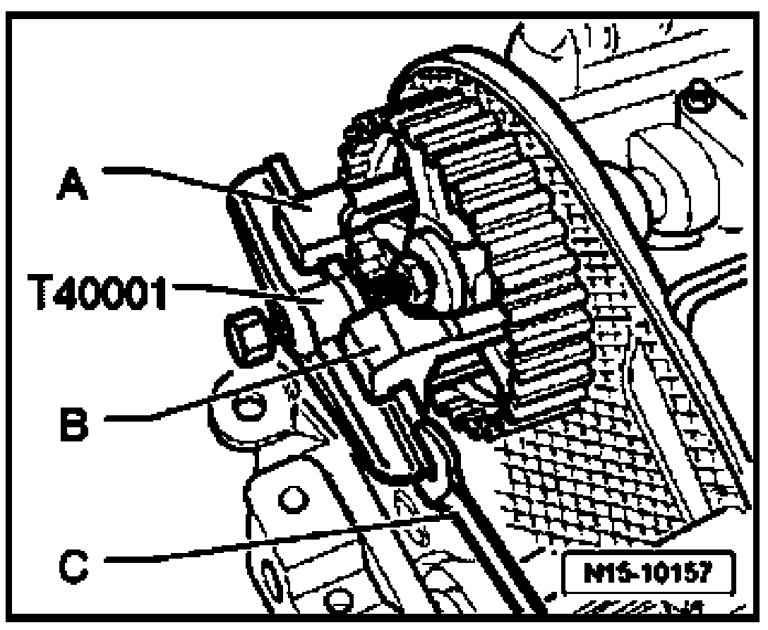 - Set puller T40001 with the one-armed claw T40001/2 - A - and the two-armed claw T40001/3 - B - centering onto the camshaft sprocket and pull it off. To counter-hold, use and open-end wrench - C -.