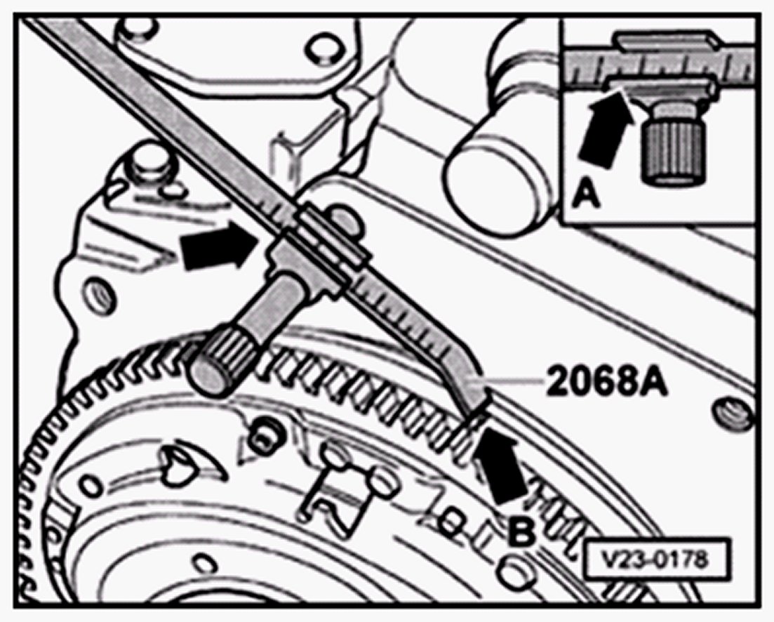 - Turn crankshaft until flywheel TDC marking aligns with point of setting device ( arrow B ).