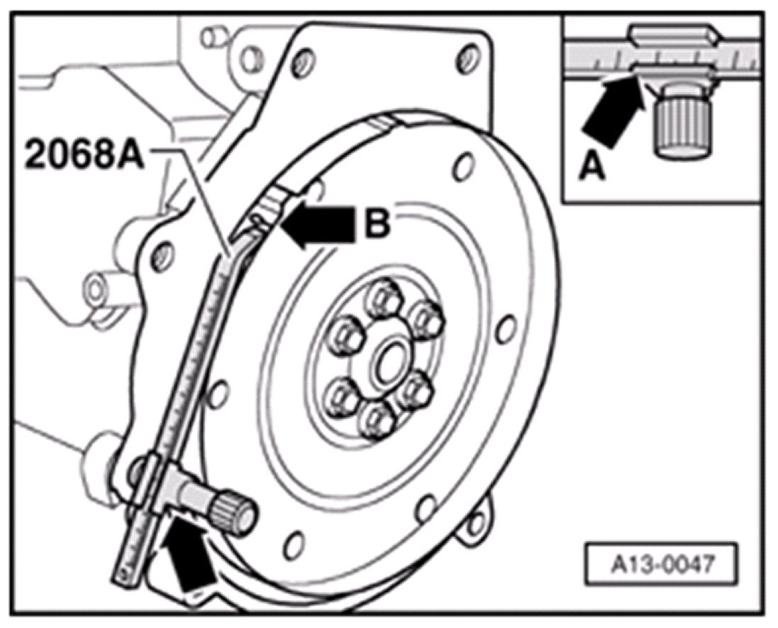 - Turn crankshaft until flywheel TDC marking aligns with point on setting device ( arrow B ).