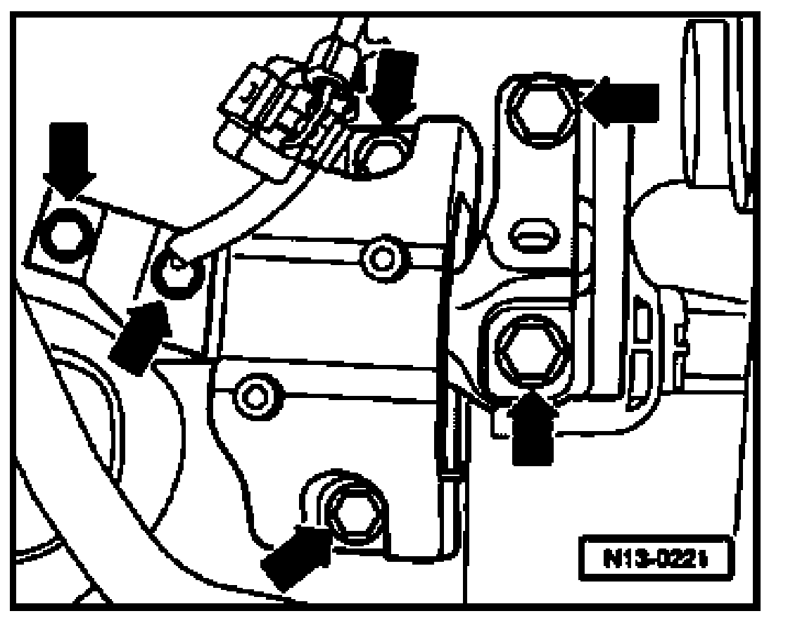 - Set engine support in place at cylinder block and fasten - arrows -. Torque specification: 45 Nm