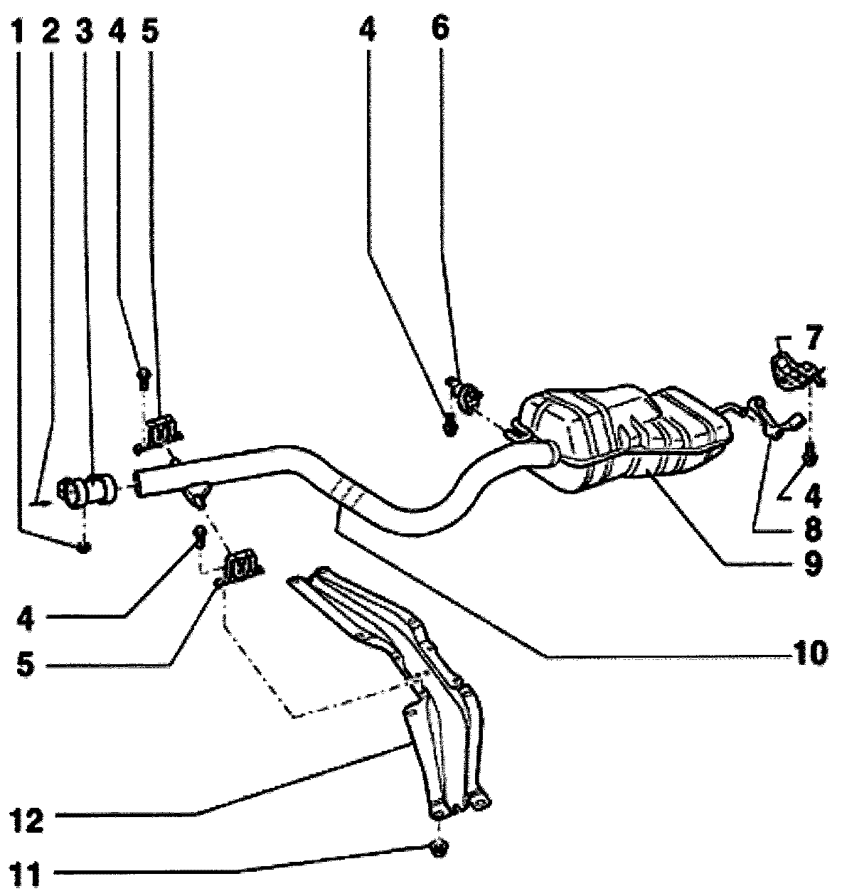 ^ In production, exhaust pipe and rear mufflers are installed as a single welded unit. For repairs the exhaust pipe and rear muffler are supplied as separate parts with a double clamp at the joint,