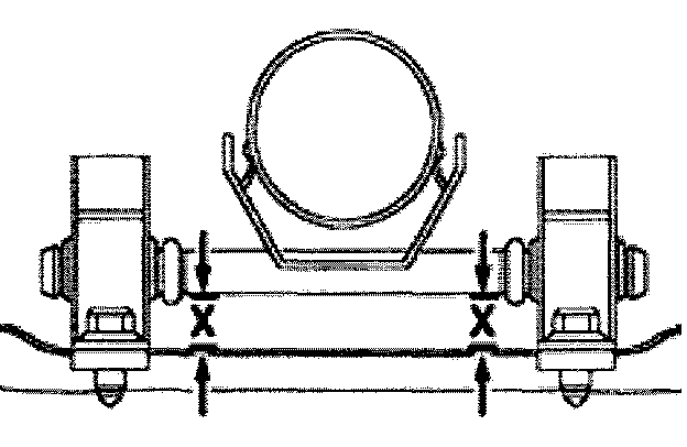Mounting pins on exhaust pipe must run parallel with tunnel bridge (dimension -x- on left and right is the same).