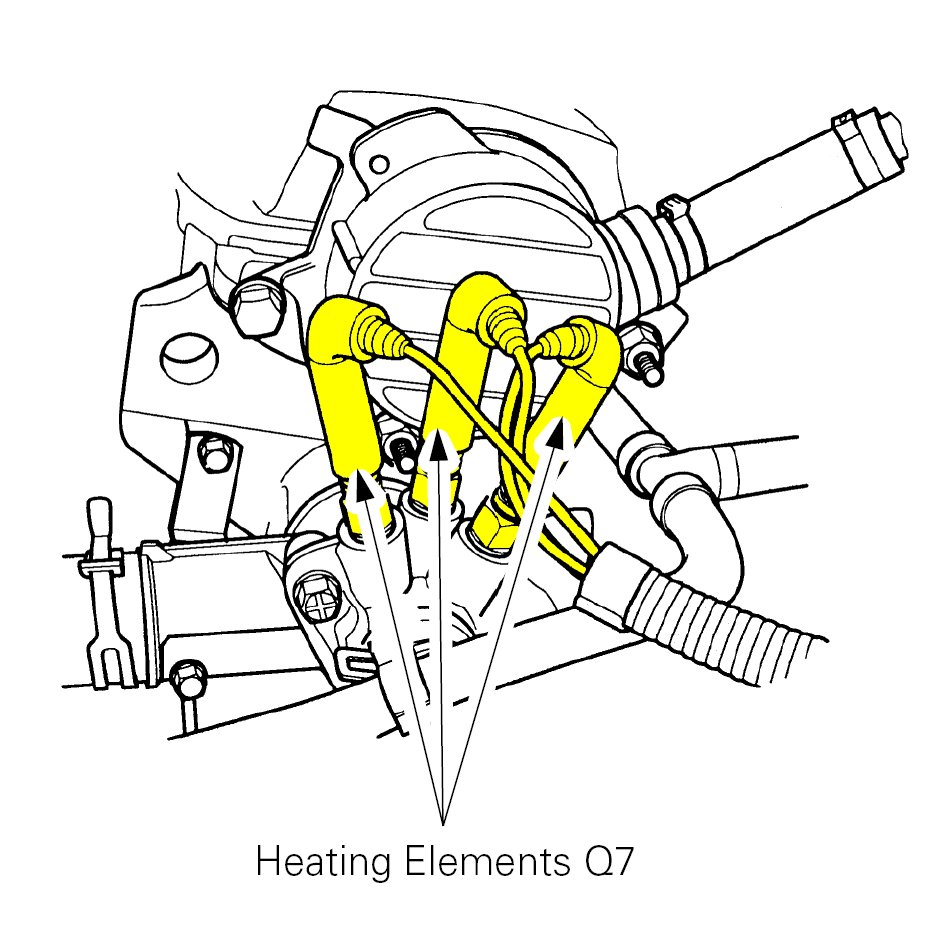 Because of their outstanding efficiency, TDI diesel engines develop little waste heat. Under certain circumstances, the heating capacity of the engine may not be adequate to provide heat to the passenger compartment. The auxiliary heater consists of three heating elements at the clutch-side coolant connection of the cylinder head. The three heating elements Q7 extend through this connection housing and into the coolant.