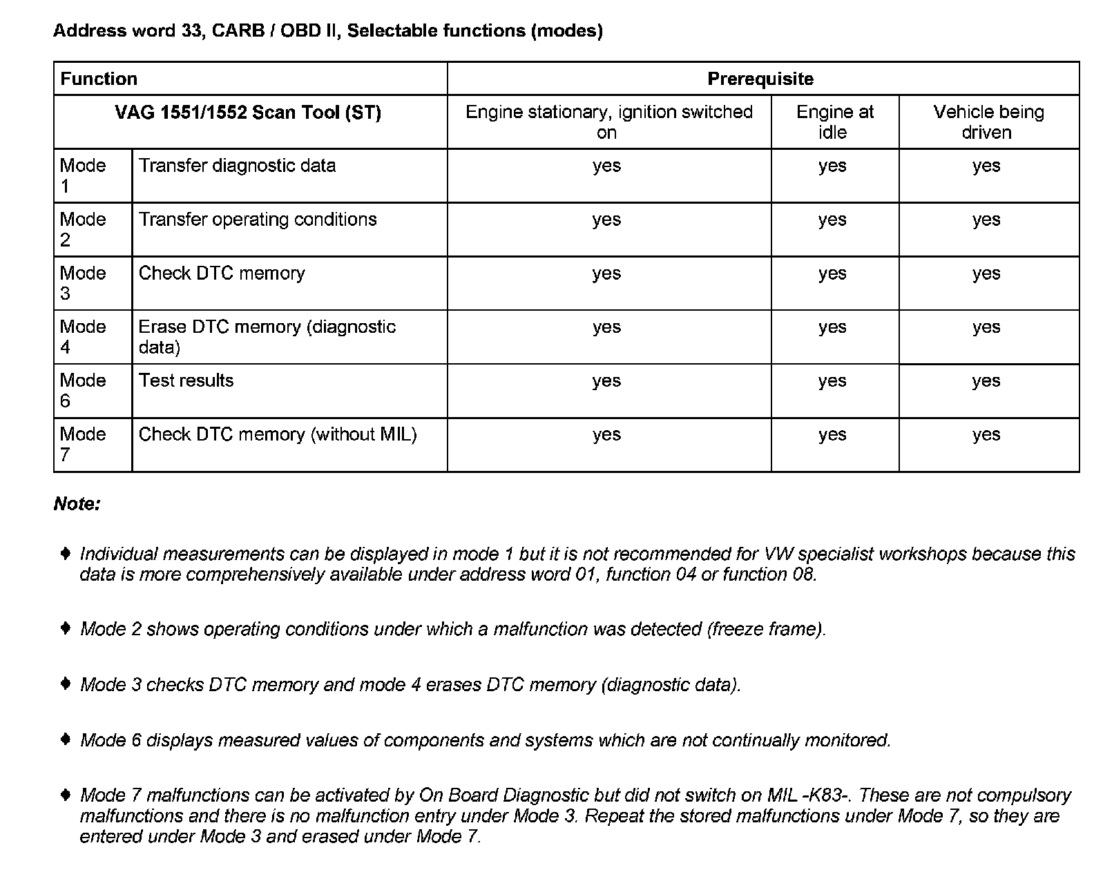 Address Word 33, CARB / OBD II, Selectable Functions (modes)