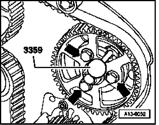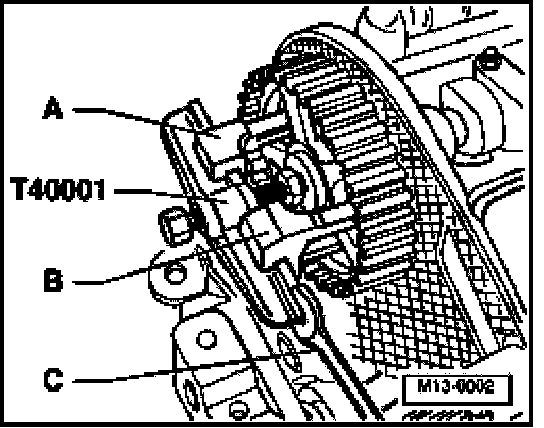 - Place puller T40001 with single leg T40001/2 -A- and double leg T40001/3 -B- centrally on the camshaft sprocket and pull it off.