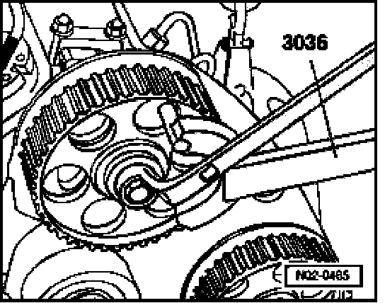- Hold camshaft sprocket with counter-hold tool 3036 and loosen camshaft bolt by 1 turn.