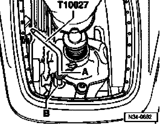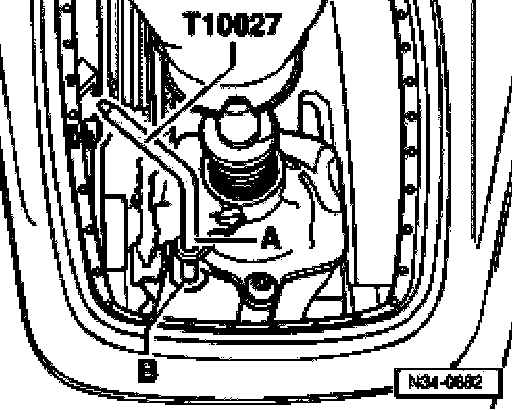 ^ Pull pin T10027 out of holes -A- and -B-.
