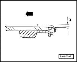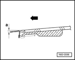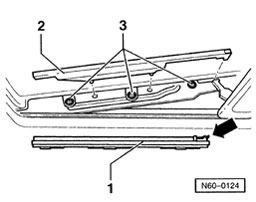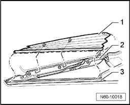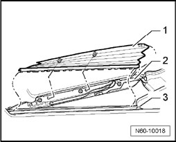 - Unclip lower trim - 1 - in rear area - arrow -, slide toward front and remove from roof frame.