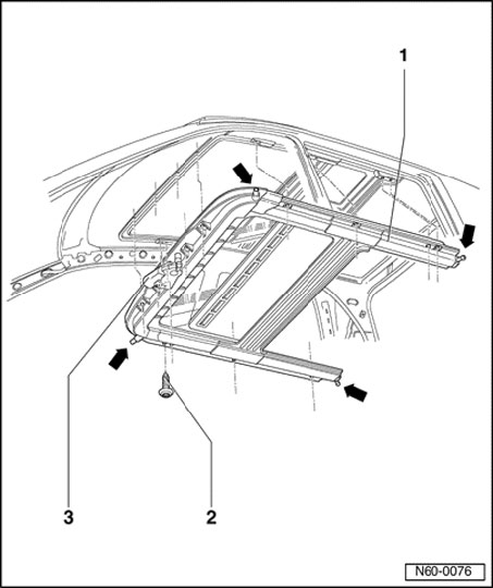 - Secure (8 Nm) installation unit - 1 - of drive motor for sunroof - 3 - beginning at left and right toward rear.