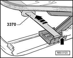 - Insert special tool 3370 between roof edge and wind deflector bearing and release wind deflector bearing from side locking tab (left and right sides) by pulling on special tool 3370.