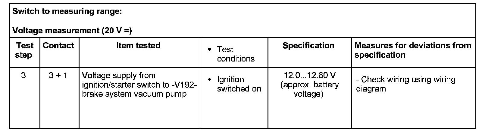 - If the readings obtained deviate from the specifications, carry out repair measure in the right-hand part of the table.