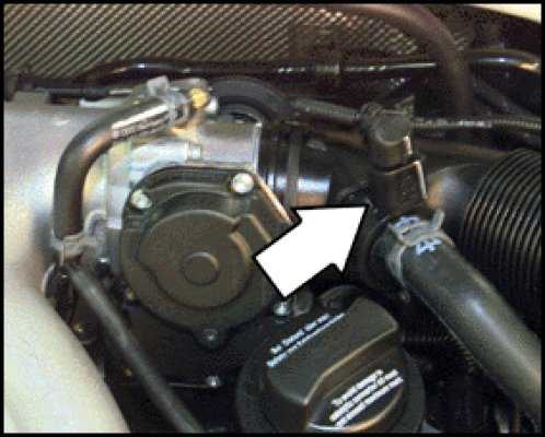 in hose between cylinder head cover and intake air duct, near throttle body