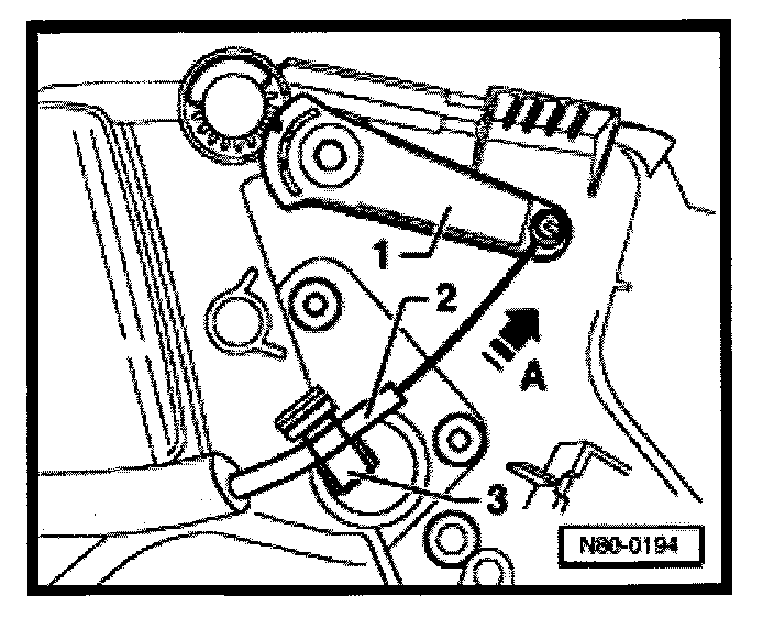 - Push central flap lever to stop -arrow A- and attach outer cable -2- with clip -3-.