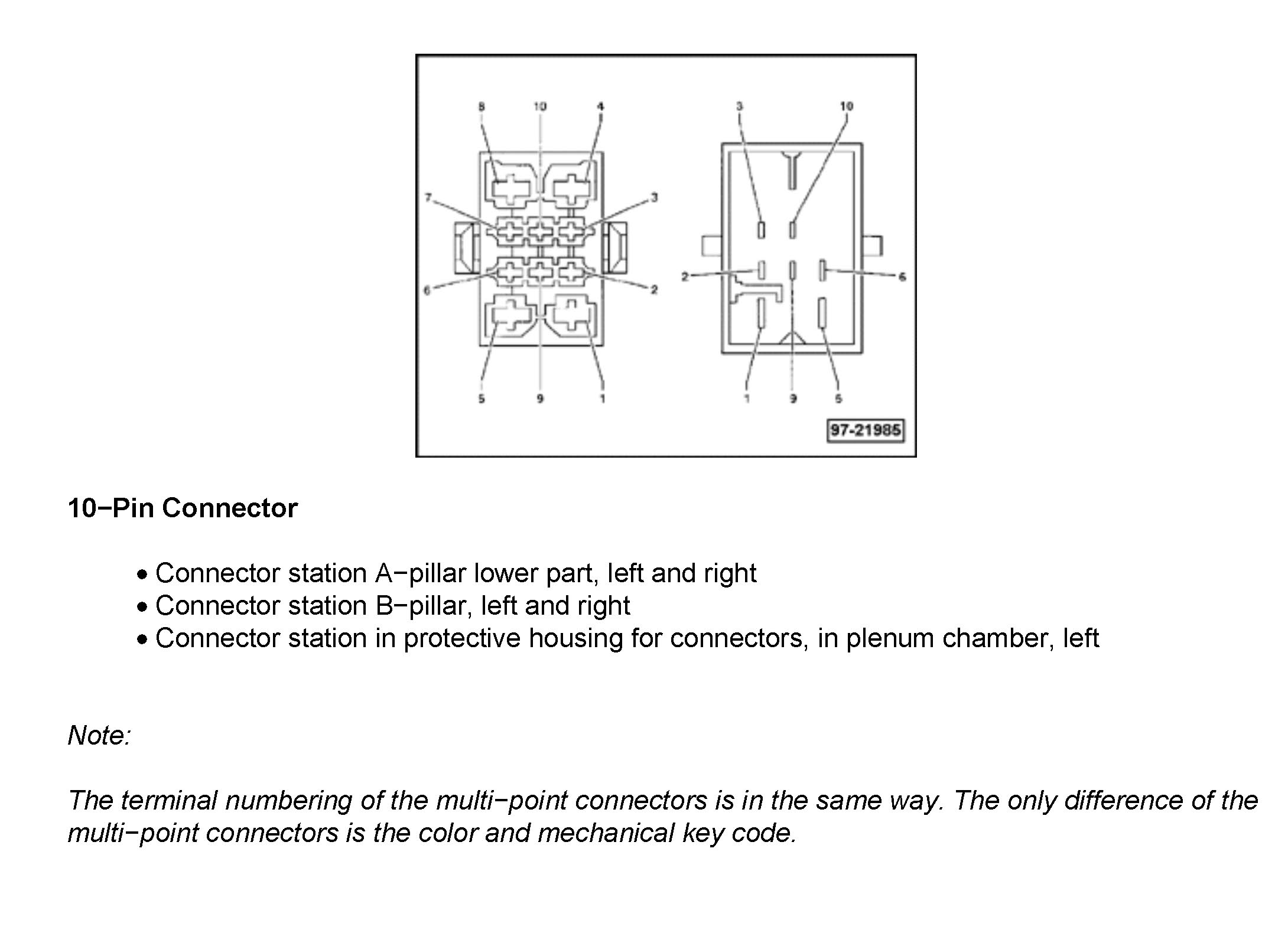 10-Pin Connector, connector station A-pillar lower part, left and right, connector station B-pillar, left and right and connector station in protective housing for connectors, in plenum chamber, left