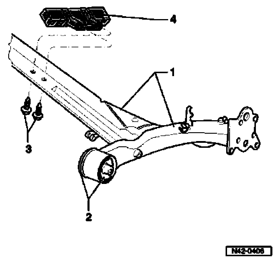 If the hydraulic bonded rubber bushing -2- is damaged, the rear axle beam must be replaced.