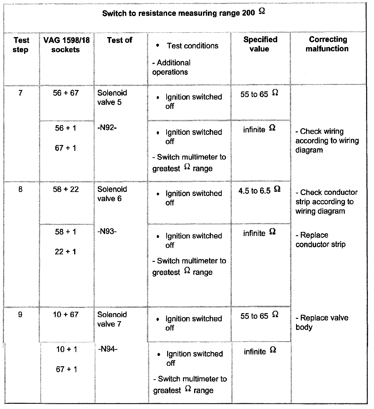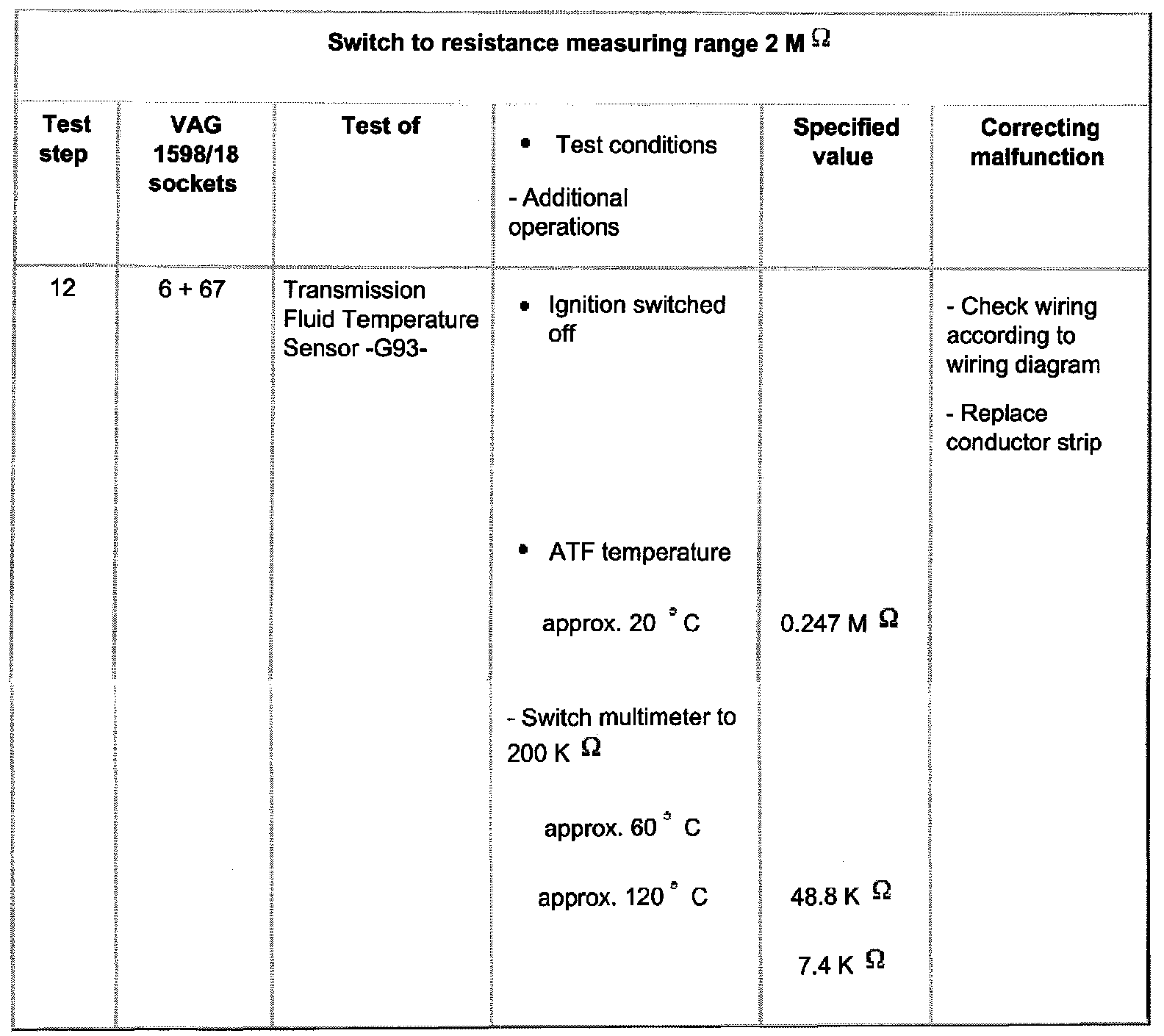 - If measured values differ only slightly from the specified values, clean the sockets and connectors of the testers and test leads and repeat the test. Before replacing the particular components, test wiring and connections and, particularly if specified values are below 10 Ohms, repeat resistance measurement on the component.
