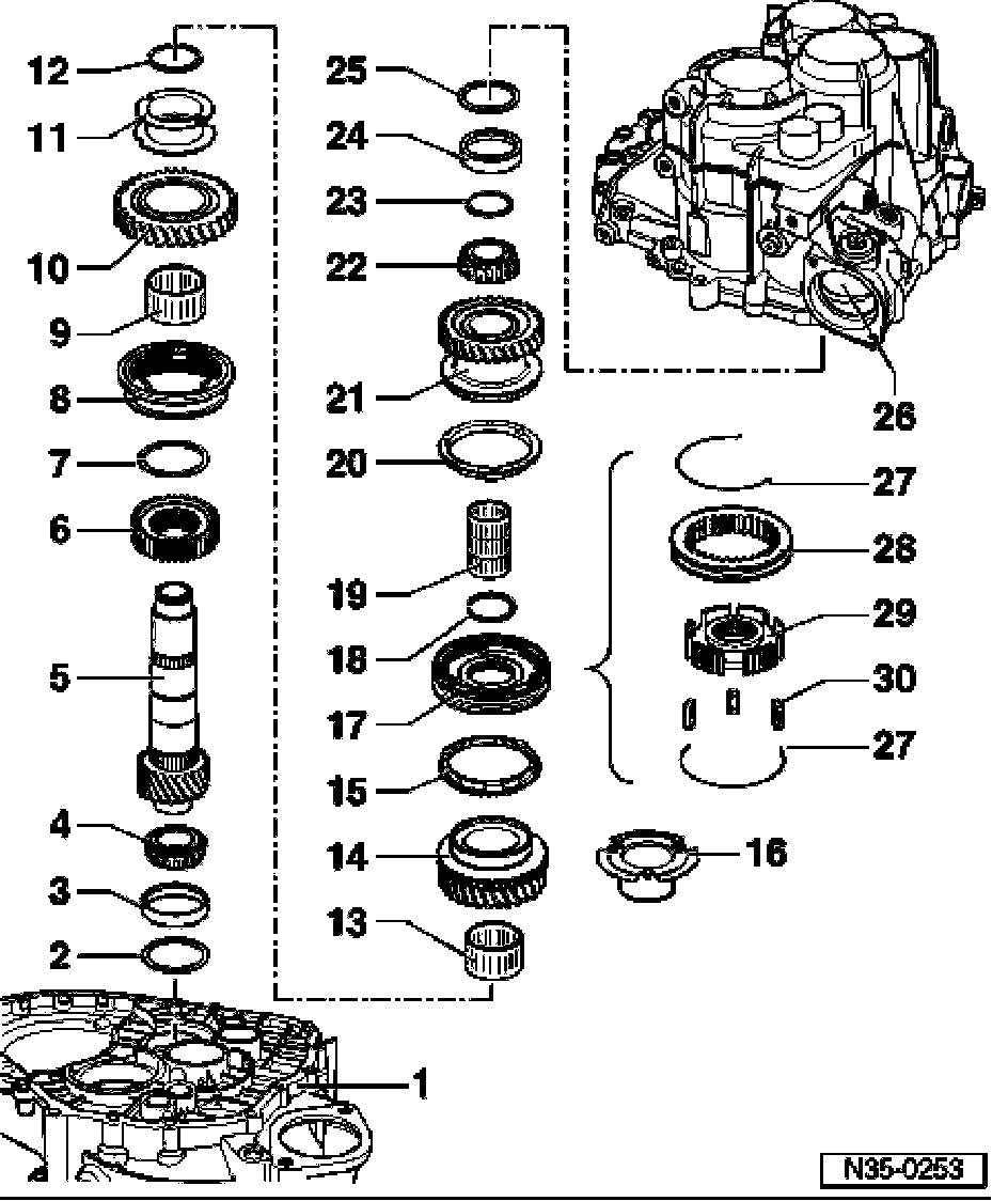 ^ After removing securing clip, press off together with 6th gear (item - 18 -), Refer to Fig. 4 or for 5-speed manual transmission, with spacer sleeve, Refer to Fig. 5