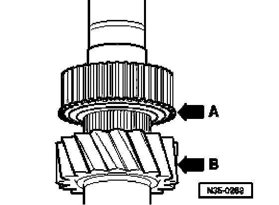 Reverse gear locking collar stop (arrow -A-) faces toward toothing of output shaft (arrow -B-).