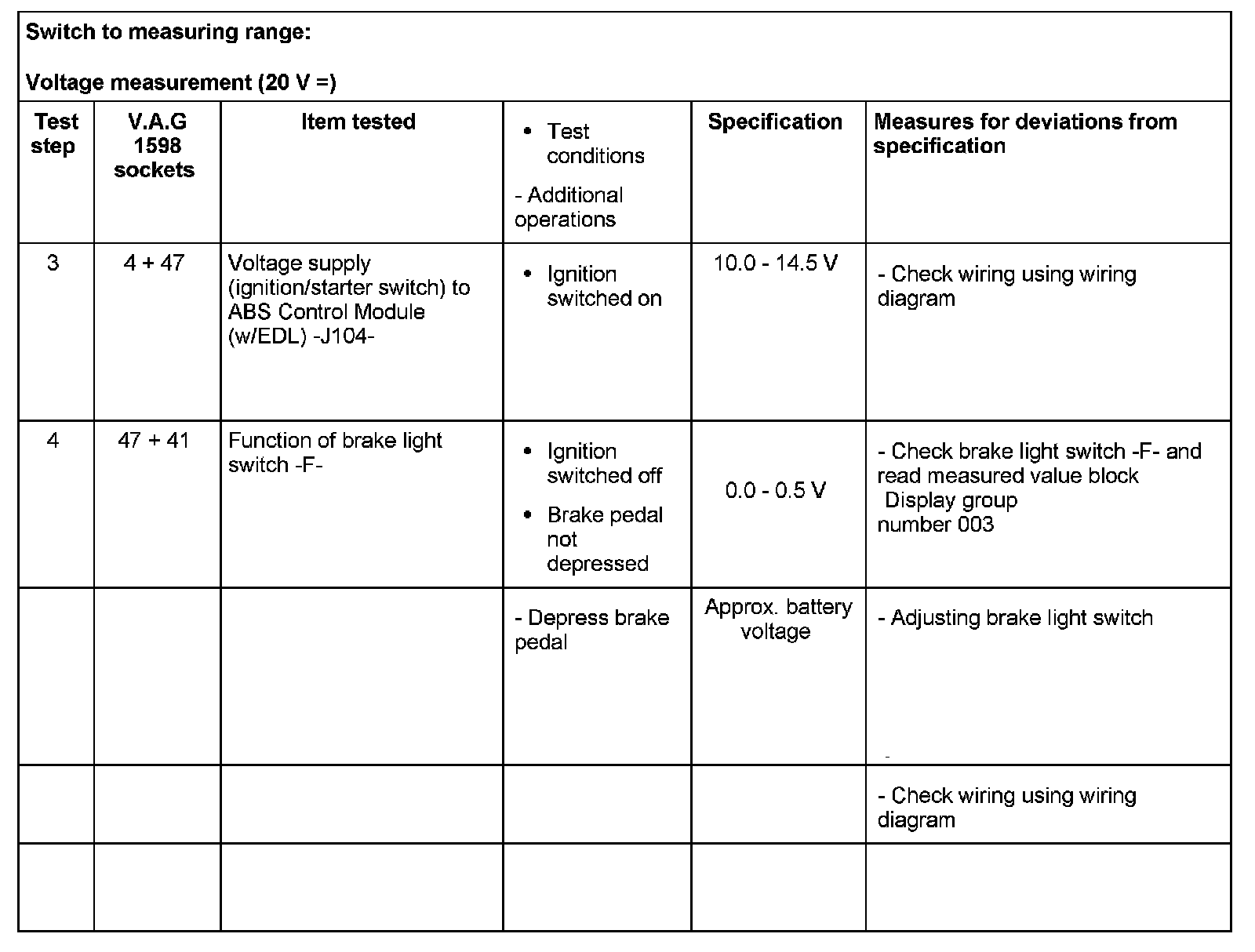 - If the readings obtained deviate from the specifications, carry out repair measure in the right-hand part of the table.
