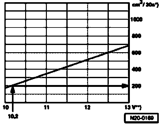 During the test, a voltage of 12.5 volts is measured at the battery. As the voltage at the pump is approximately 2 volts less than the battery voltage, the result is a minimum delivery of approximately 200 cm3/30 seconds.