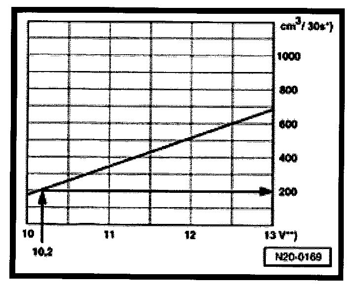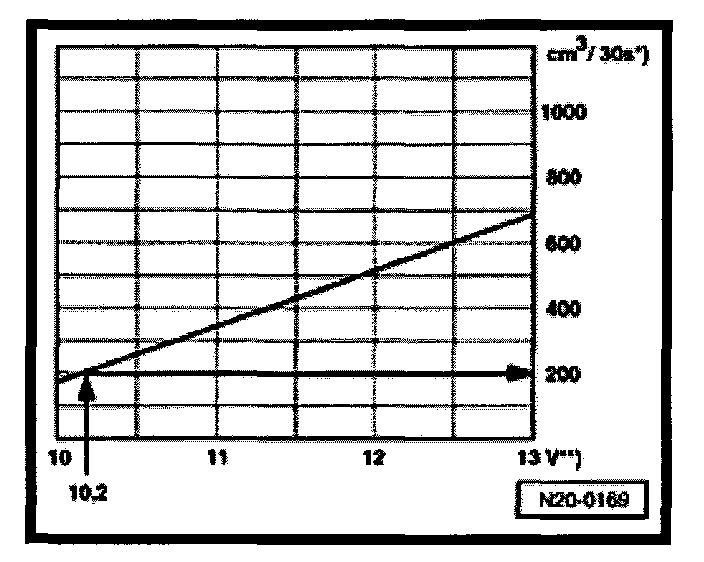 During the test a voltage of 12.5 volts is measured at the battery. As the voltage at the pump is approx. 2 volts less than the battery voltage then this will equate to a minimum delivery of 200 cubic cm/30 s.