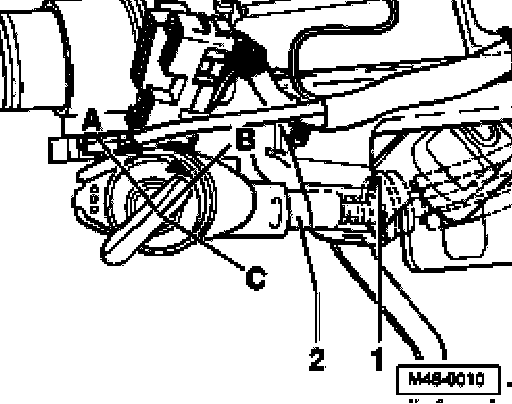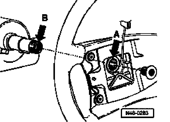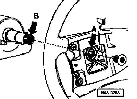- Install steering wheel so marked line -arrow A- on steering wheel and center punch mark -arrow B- on steering column align.