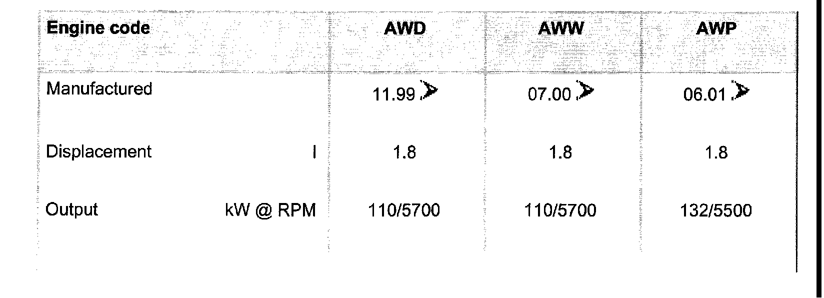 Note: The engine codes-arrow-are also imprinted on the front engine lift (visible after removing cover above fuel injectors).