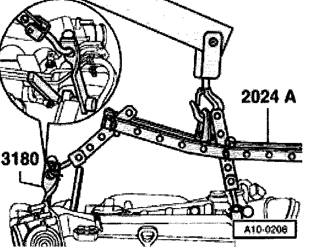 - Attach lifting tackle 2024A with bracket 3180 as follows and lift off engine/gearbox jack V.A.G 1202A with workshop crane V.A.G 1383 A.