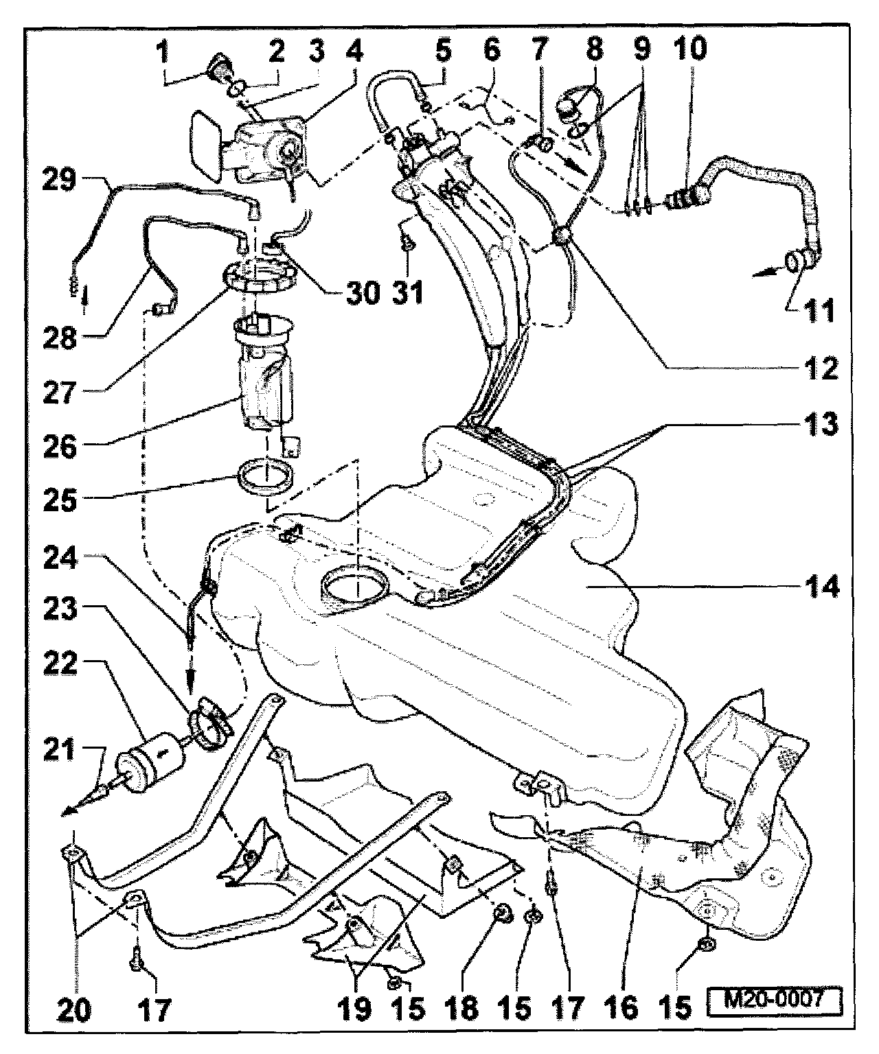 Marking on sender must align with the marking on fuel tank -arrows-.