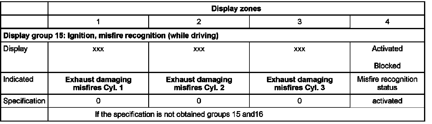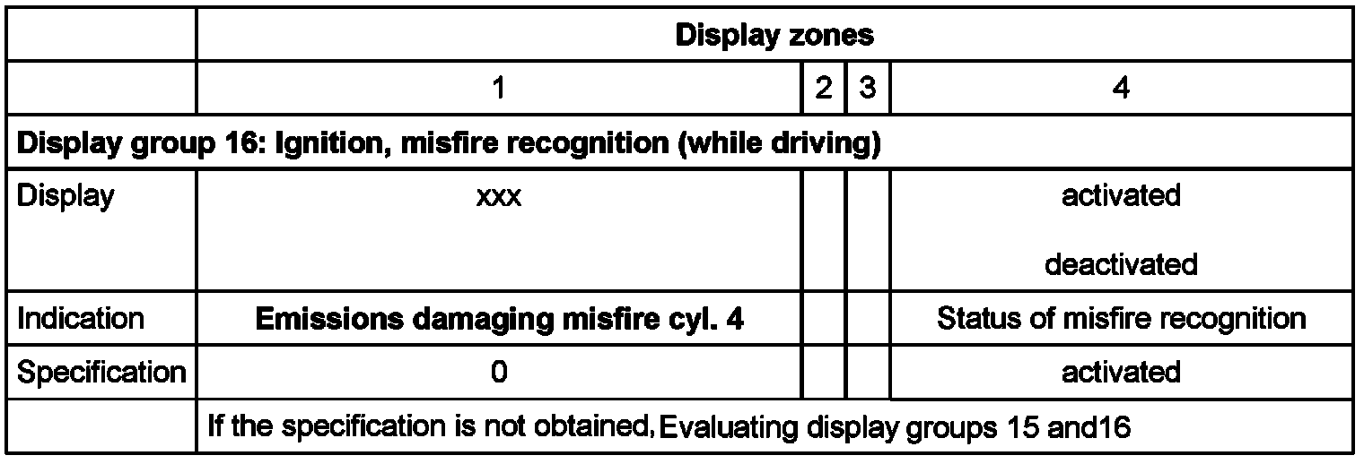 Evaluating display groups 15, display zones 1 to 3 and display group 16, display zone1.total number of exhaust damaging misfires Cyl. 1 to Cyl.4