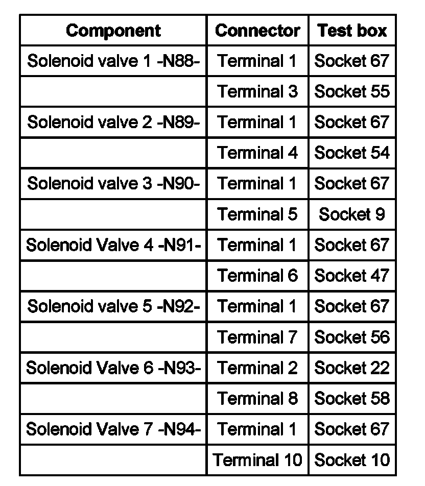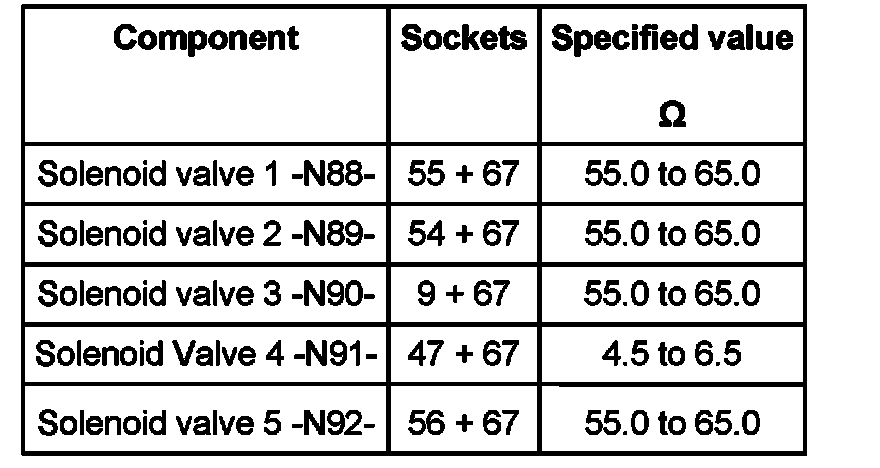 - Measure resistance of solenoid valves at test box between socket of corresponding solenoid valve to socket 1 according to wiring diagram: