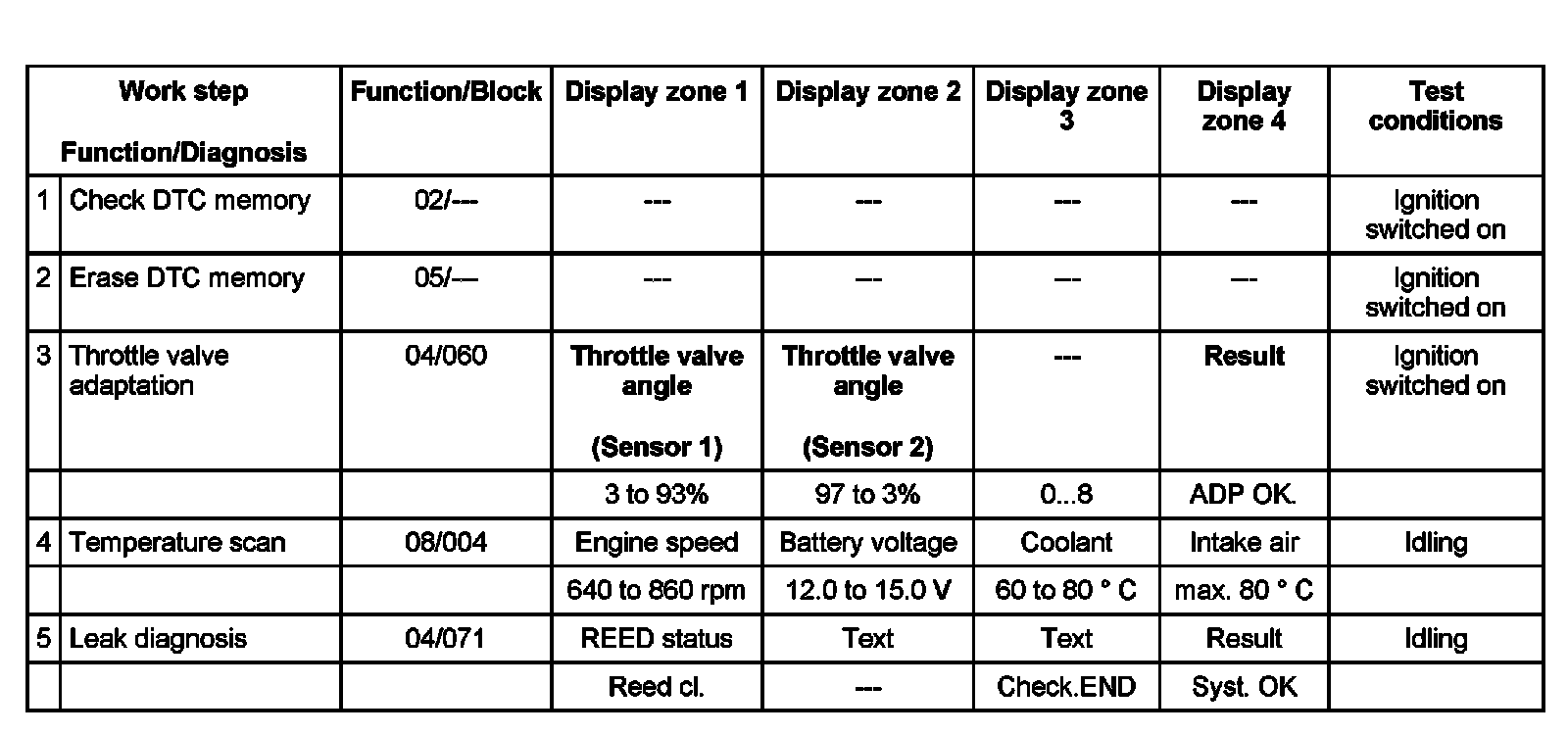 NOTE: If the display in display zone 4 jumps from "Test ON" to "Test OFF" during the diagnosis and "Abort" is displayed in display zone 2, repeat the Leak diagnosis. When repeating the diagnosis it can take up to approx. 60 seconds before the display in display zone 4 jumps from "Test OFF" to "Test ON".