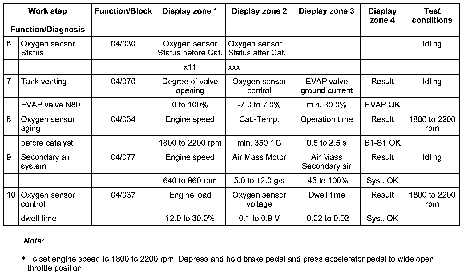 - Maintain engine speed at 1800 to 2200 rpm until display in display zone 4 jumps from "Test OFF" to "Test ON". Catalyst temperature in display zone 2 must be at least 440 degrees C.