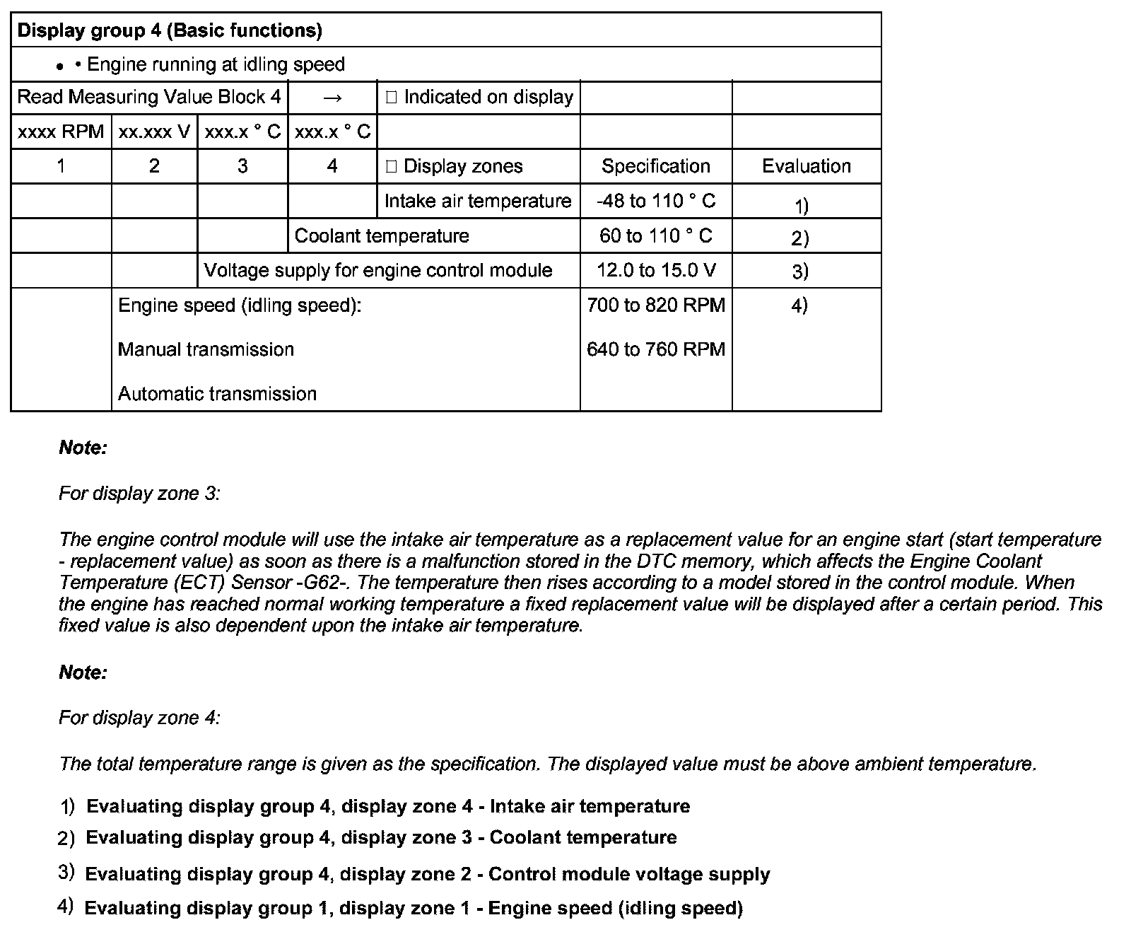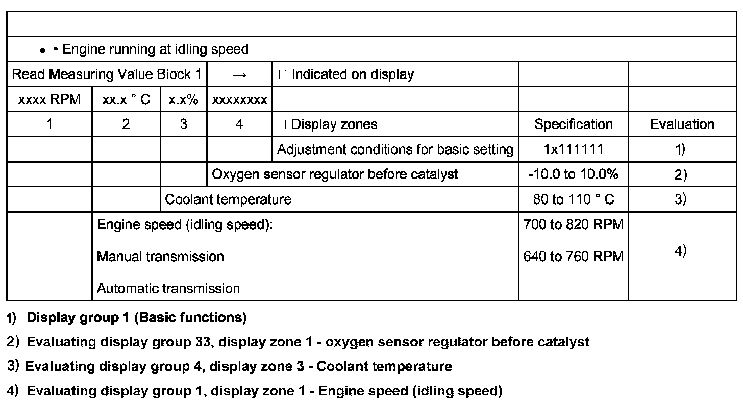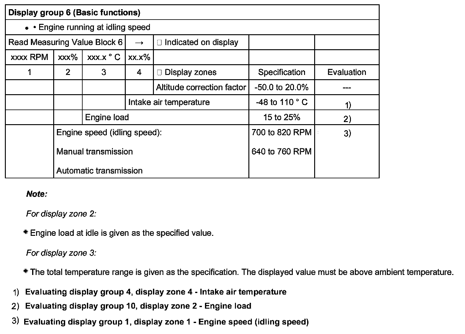 Evaluating display group 1, display zone 1 - Engine speed (idling speed)
