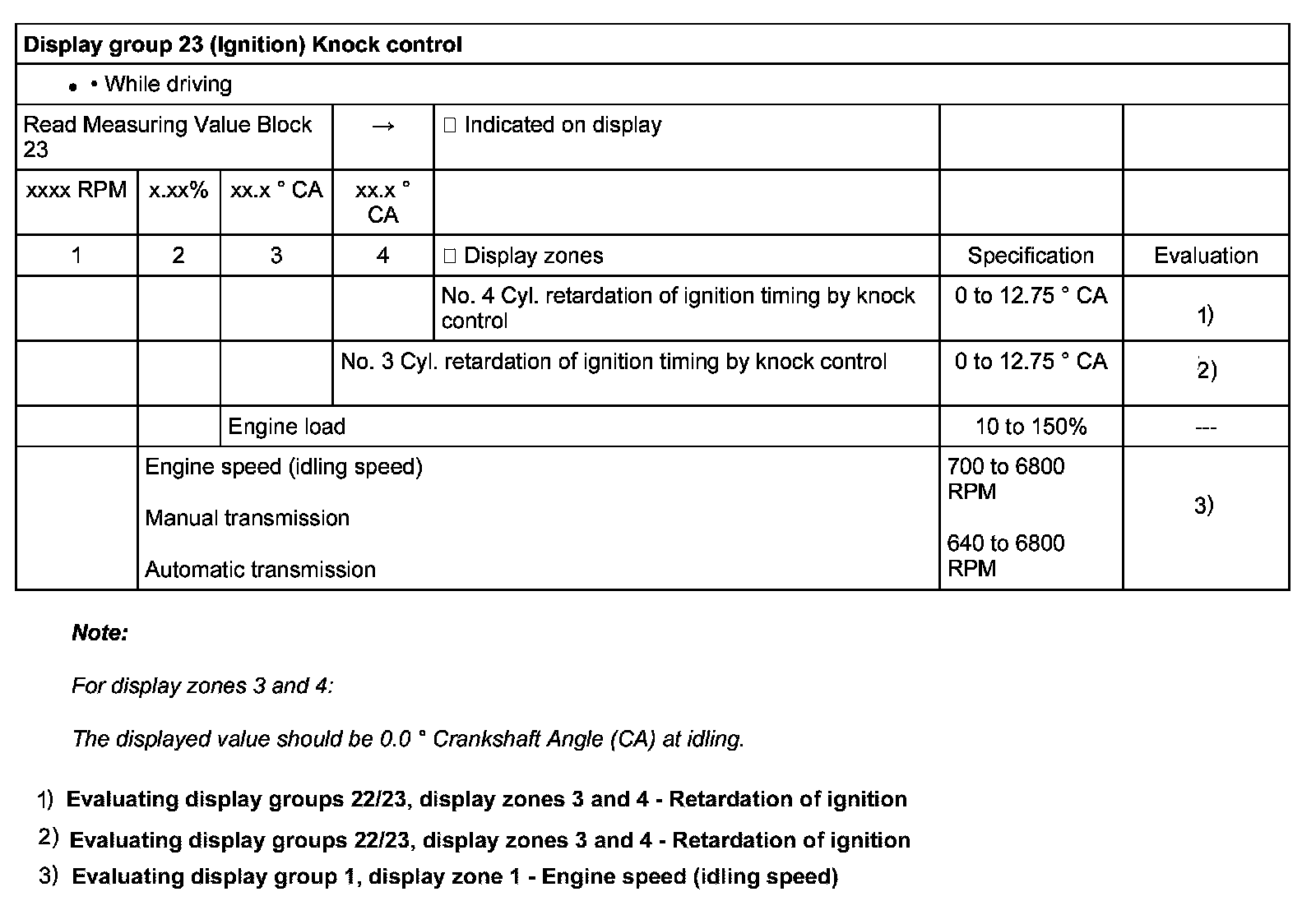 Evaluating display groups 22/23, display zones 3 and 4 - Retardation of ignition