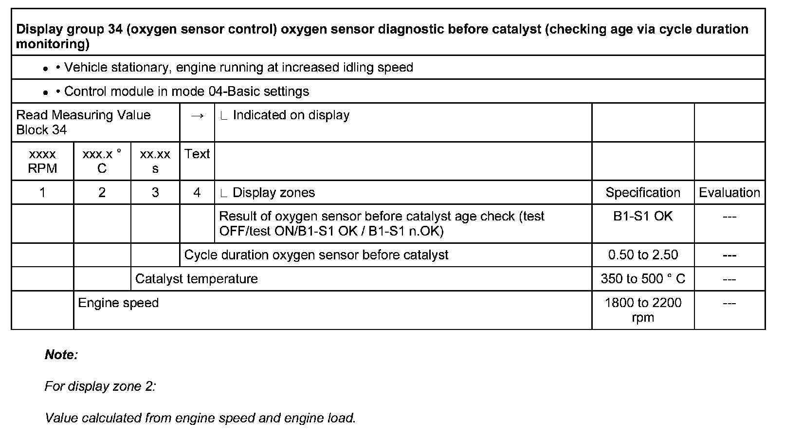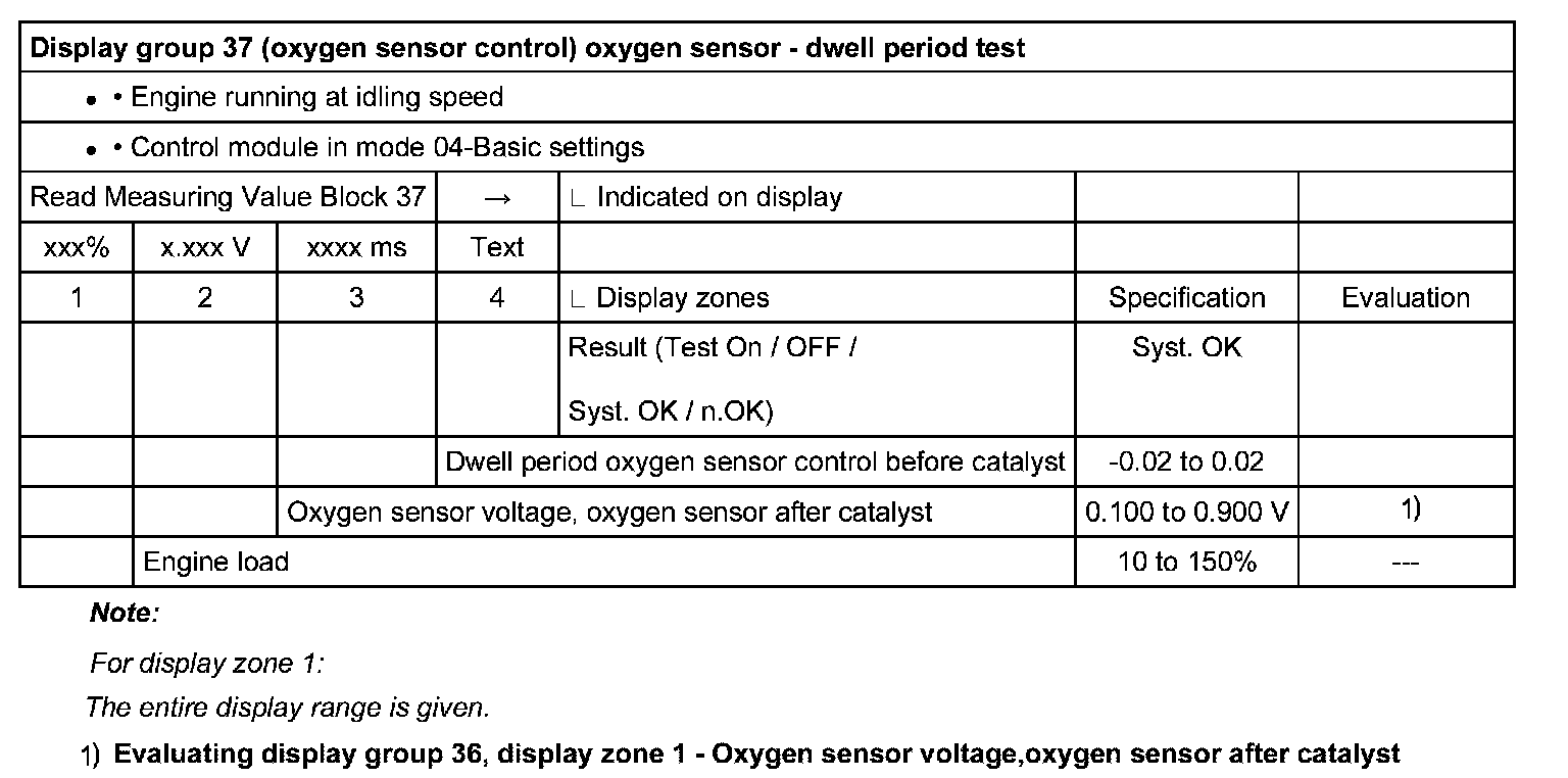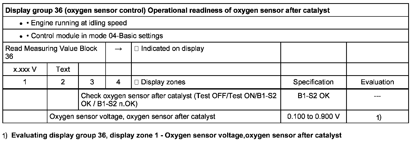 Evaluating display group 36, display zone 1 - Oxygen sensor voltage,oxygen sensor after catalyst