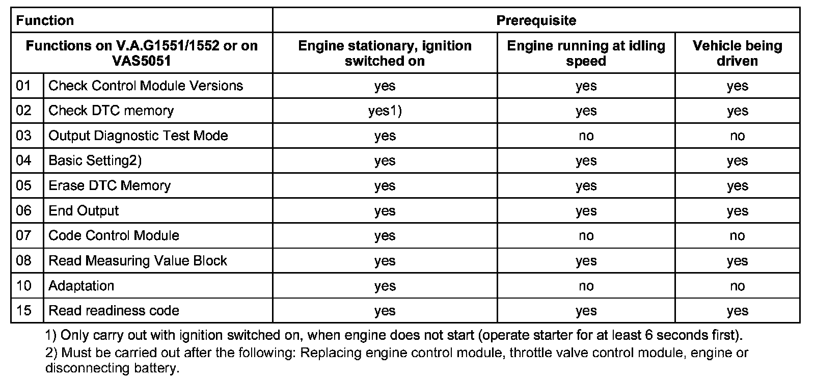 Selectable Functions When Using VAG1551/1552 or VAS5051