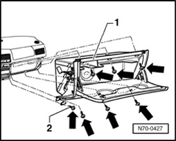 NOTE: If only glove compartment is to be removed, center console must be removed first because bolt -2 - is otherwise not accessible.