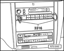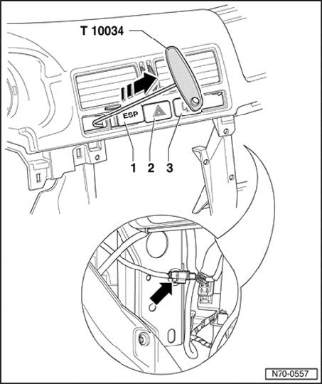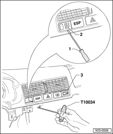 - Using Assembly tool T10034 unclip ESP switch - 1 -, indicator light - 2 - and rear window defroster - 3 - out of center vent in direction of - arrow -.