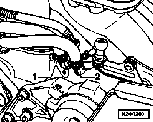 - Pull fuel supply hose -1- (with white marking) and fuel return hose -2- (with blue marking) off fuel rail and collect fuel that may leak out with a cloth.