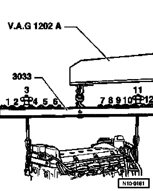 - Attach lifting device 3033 as follows and lift engine from engine/transmission jack VAG 1383 using workshop crane VAG 1202.