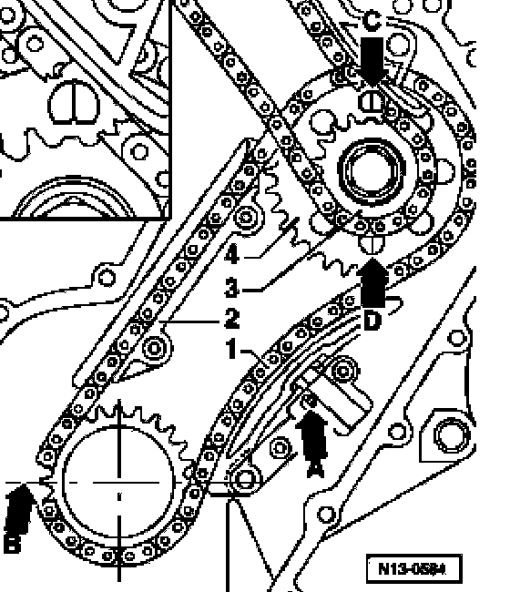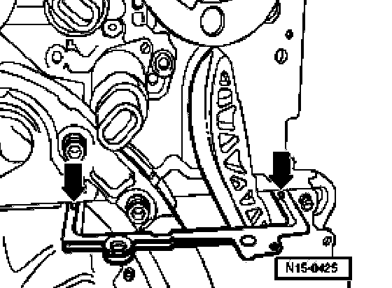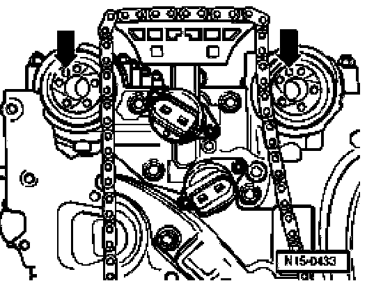Note: When the crankshaft is turned, the tensioning rail must be pressed against the camshaft roller chain by hand instead of with the chain tensioner.