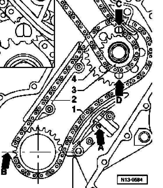 - Release locking splines of chain tensioner -A- with a small screwdriver and tensioning plate pressed against chain tensioner.