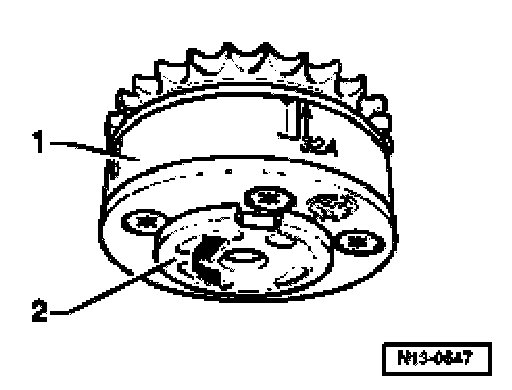 - Check distance between tooth -1- and tooth -2- of camshaft timing adjuster. It must be exactly 16 rollers of camshaft roller chain.