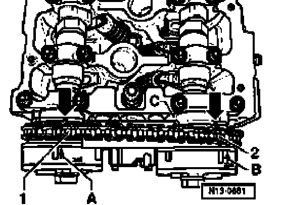 - Position both camshaft timing adjusters (identification: 24E on inlet side and 32A on exhaust side) on the camshaft mountings -arrows-.