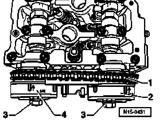 - Tighten new securing bolts -3- for intake and exhaust camshaft timing adjusters -4 and 2- to 60 Nm + 90°(1/4 turn - turning further can be done in several stages).